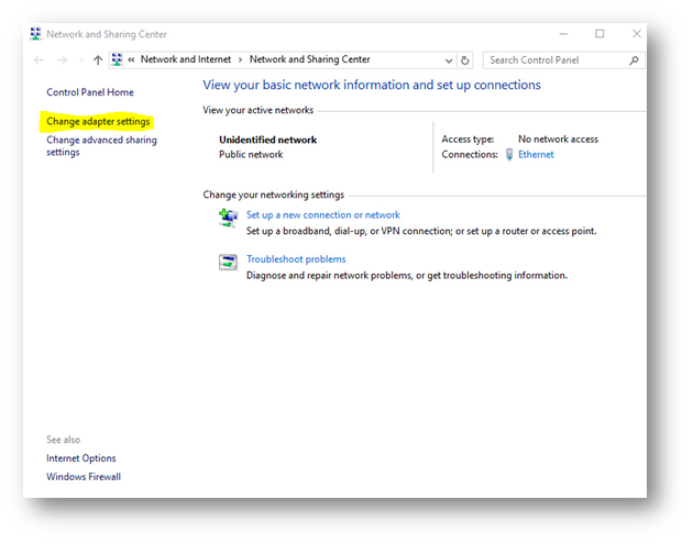 Network and Sharing Center ekranında “Change adapter settings” seçeneğine tıklıyoruz.