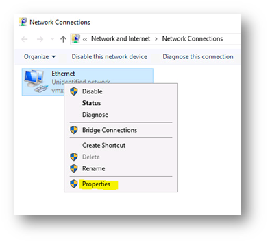 Network Connections penceresi açılacak. Ethernet bağlantısını sağ tıklayıp “Properties” seçeneğini tıklıyoruz.