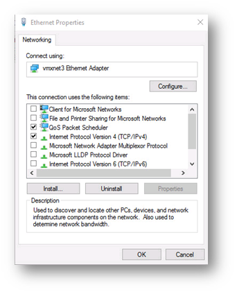 Ethernet Properties penceresinde ayarlarımıza başlıyoruz. IIS veya APP sunucusu olarak yapılandırma yapıyorsanız güvenlik sebebi ile aşağıdaki ayarları yapmanızı tavsiye ederim. . “Internet Protocol Version ( TCP/IPv4)” ve “Qos Packet Scheduler” seçenekleri aktif kalacak şekilde düzenliyoruz. Standart kullanımlarda, test ortamlarında yada AD DS, File Server gibi rolelerde kullanılacaksa sunucunuz bu işlemleri yapmanıza gerek yoktur. Sadece IPv6 kapatmanız yeterli olacaktır.