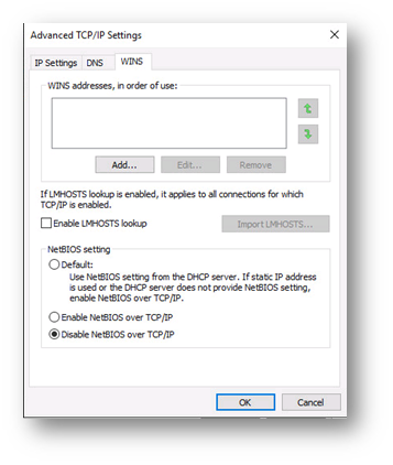 “WINS” sekmesine geçiyoruz. Enable LMHOSTS lookup seçeneğinin yanındaki boxtan işareti kaldırıyoruz. “Disable NetBIOS over TCP/IP” seçeneğini işaretliyoruz.
