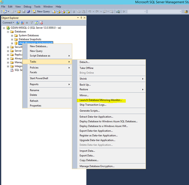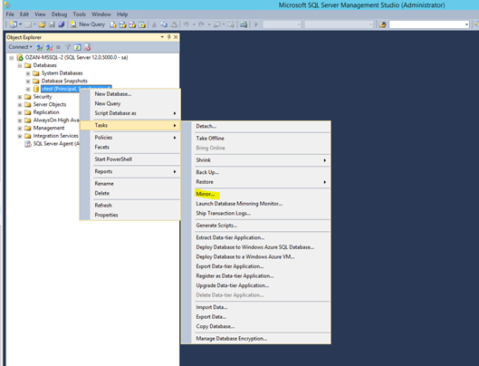MSSQL2 şuanda principal olan sunucuma gidiyorum ve tasks menusu adımından mirror adımına gidiyorum.