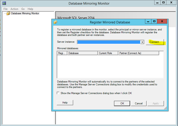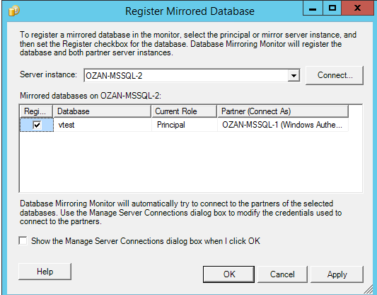 Register mirrored database penceresinde connect butonuna basarak MS SQL mizi seçiyoruz.