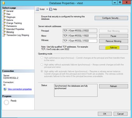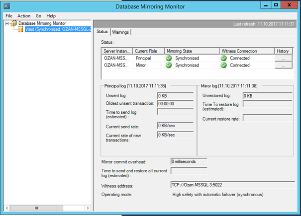 Database mirroring monitor penceresinde SQL sunucularımın sync olduğunu ve dataların eşit olduğunu görüyoruz.