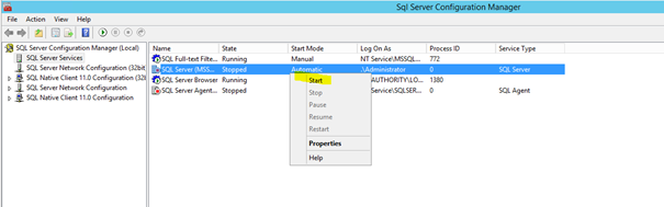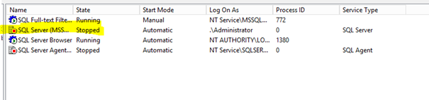MSSQL 1 yani down olan eski principal sunucumdaki sorunu giderdiğimizi varsayalım ve gidip servisimizi tekrar start edelim.