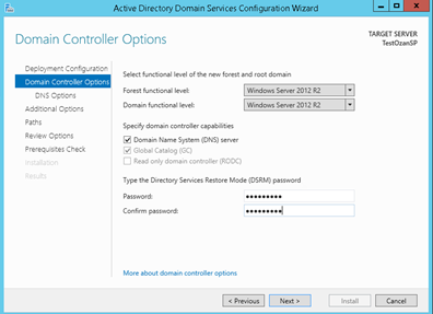 “domain controller options” bölümündne DSRM şifresi belirleyerek next butonuna basıyoruz.