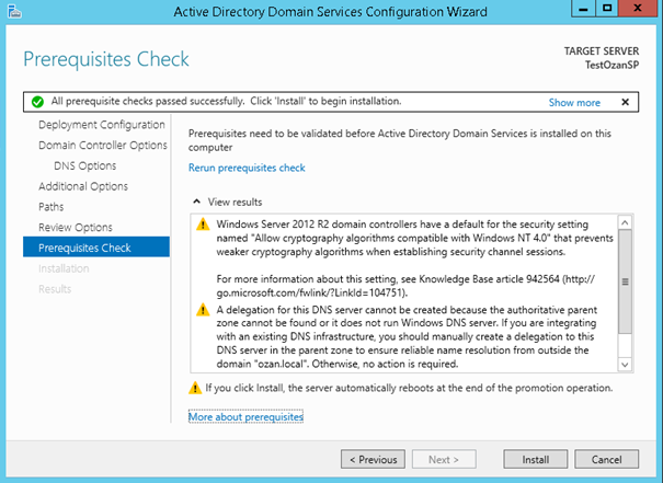 “Prerequistes check” bölümünde “Install” butonuna basıyoruz.