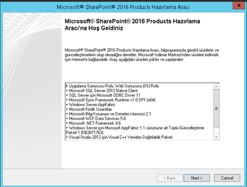 İlk olarak ISO içerisinde bulunan “prerequisiteinstaller” çalıştırıyoruz. Bu şekilde sunucumuzu SharePoint için uygun yapılandırmaları hazırlamış oluyoruz.
