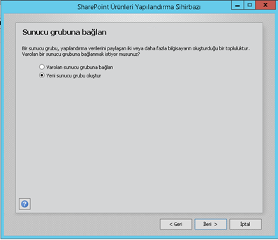 Sunucu grubuna bağlan penceresinde kurmuş olduğumuz SQL yapılandırmasını hazırlamak için seçim yapıyoruz yeni bir SharePoint sunucusu kuruyorsanız. “yeni sunucu grubu oluştur” seçip ileri butonuna tıklıyoruz.