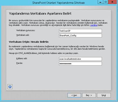 Yapılandırma veritabanı ayalarını belirt bölümünde SQL sunucumuzun erişim bilgilerini giriyoruz. Next butonuna tıklıyoruz.