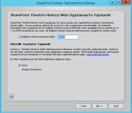 SharePoint yönetim merkezi web uygulaması’nı yapılandır penceresinde erişim portumuzu belirliyoruz. İleri butonuna basıyoruz.