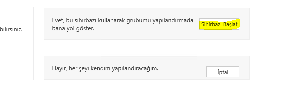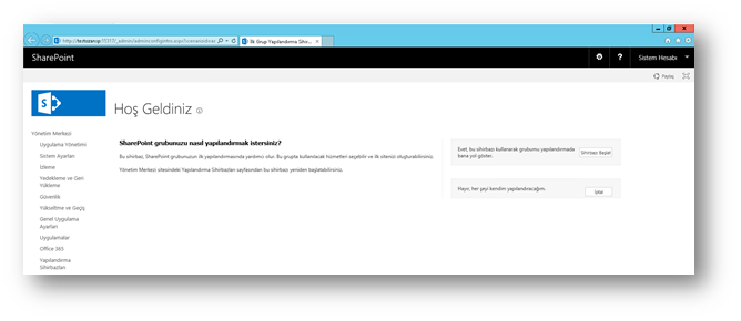 SharePoint adresinizden vermiş olduğunuz port numarası ile giriş yaparak sağ bölümde bulunan “sihirbazı başlat” butonuna basarak yapılandırma işlemine başlıyoruz.