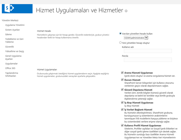 “Hizmet Uygulamaları ve Hizmetler” bölümünden Hizmet hesabı ve hizmet uygulamalarını çalışma tercihimize göre seçiyoruz. İleri butonuna basıyoruz.