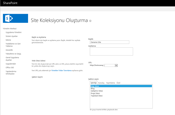 Site koleksiyon oluşturma bölümü karşınıza gelecektir. Bu bölümde çalışma alanları oluşturabilirsiniz. Test amaçlı Ekip sitesi olarak seçim yaparak tamam butonuna basıyoruz.