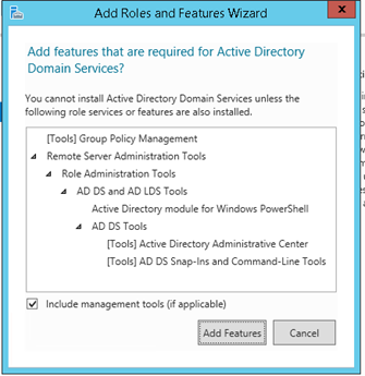 AD DS için gerekli role ve features listesini görüyoruz. “Add Features” butonuna basarak devam ediyoruz.
