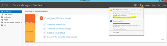 Kurulum bittikten sonra server manager dashboarddan kurulmuş olan AD DS için “promote this server to a domain controller” linkine tıklıyoruz.