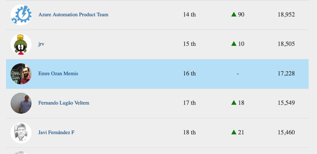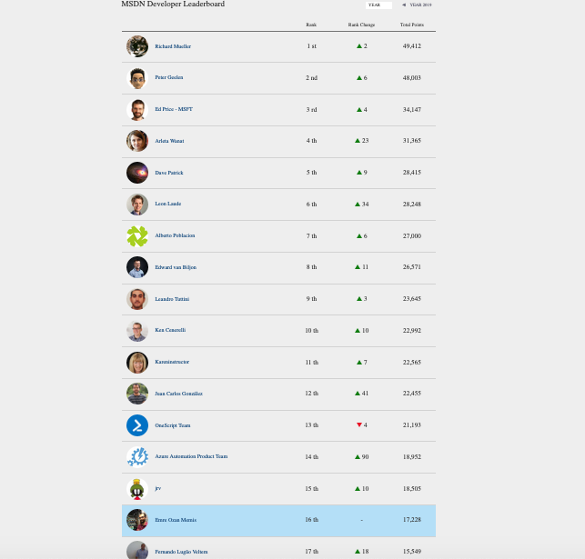 Technet ve MSDN üzerinde yaptığım çalışmalar ile yılı 16. kapatıyorum. 1 yıl içerisinde bu özel toplulukta ilk 20 de olmak büyük bir mutluluk bu başarıyı sizlerle paylaşmaktan onur duyuyorum. İlgi gösteren herkese teşekkür ederim.