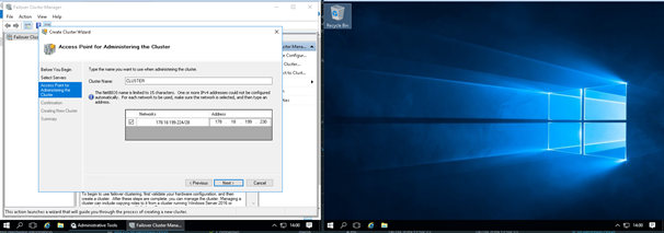 Clsuter kurulumunun “Access point for administering the cluster” adımında failover clusterimiz için isim ve IP tanımlamasını yapınız.