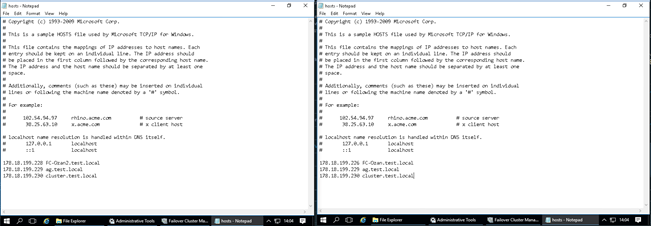 Faiover cluster kurulumumuz tamamladıktan sonra yapılandırmamız gerekiyor. Yapılandırma sırasında bağlantı sorunu yaşamamak için host dosyasına belirlediğimiz FQDN adreslerini ver IP adreslerini giriyoruz.