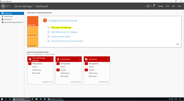 Dashboard dizininde bulunan “Add roles and features” adımını tıklıyoruz ve kurulum için işlemlere başlıyoruz.