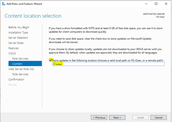 “Content location selection” adımında WSUS tarafından indirilecek güncelleme paketleri için bir dizin belirtmeniz istenecektir. Sizin için uygun bir path belirterek next butonua basıp devam ediniz.