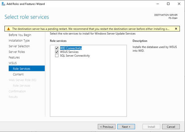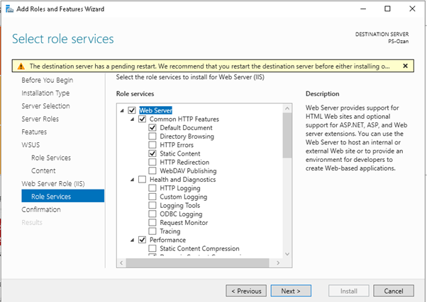 “Select role services” adımında WSUS için gerekli olan web server roles and features zaten seçili gelecektir. Next butonuna basarak devam ediniz.