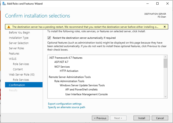 “Confirm installation selections” adımında özetimizi görüntülüyoruz. “Restart the destination server automatically if requşred” seçeneğini işaretleyiniz. Bu işlem ile kurulum sırasında yada kurulum sonrası restart gerekirse sistem otomatik olarak gerçekleştirip sürece devam edecektir.