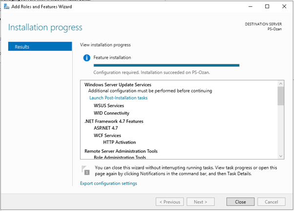 İşlem tamamlandıktan sonra close butonuna basıyoruz. İlgili güncelleme paketleri download edilmeye başlayacaktır. Download işlemi otomatik yapılmaktadır. Disk kullanımını bu süreçte kontrol etmenizde fayda vardır. WSUS yapılandırma sırasında belirttiğiniz path üzerinden indirilen güncelleme paketlerini zaman içerisinde göreceksinizdir.