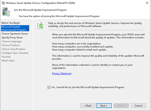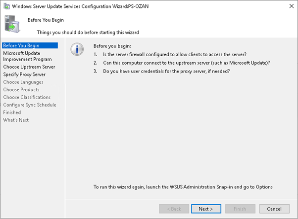 WSUS yapılandırma işlemleri için karşımıza Configuration wizard penceresi gelecektir.