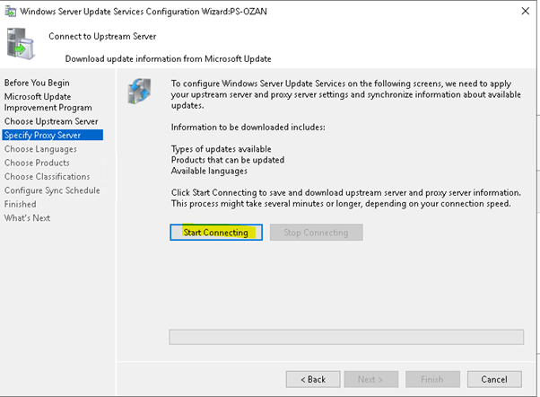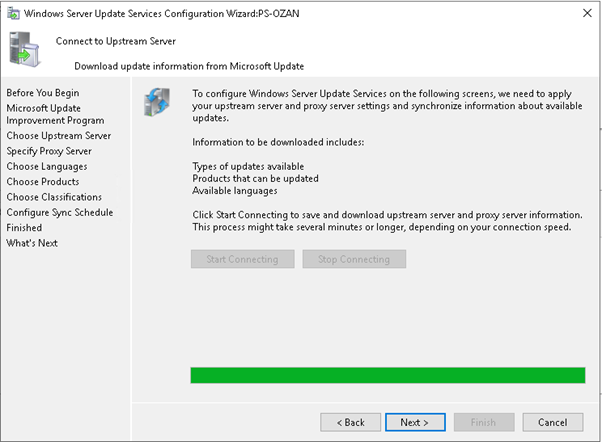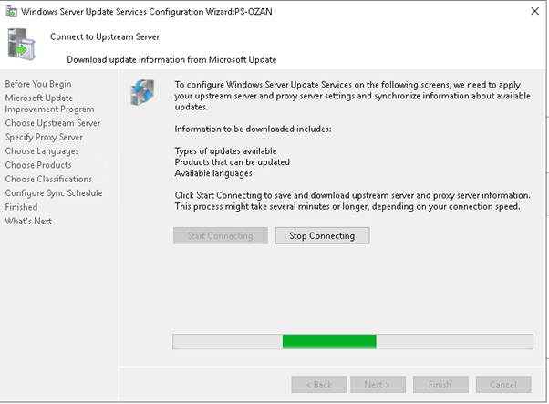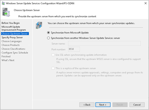 “Choose Upstream server” adımında sync durumunu yapı ve kullanım şeklinize göre yapılandırabilirsiniz. Yapınızda başka bir wsus var ise SYNC from onether WSUS seçebilirsiniz. Eğer yapınızda ilk WSUS kurulumunuz ise SYNC from Microsoft Update seçmeniz gerekmektedir.