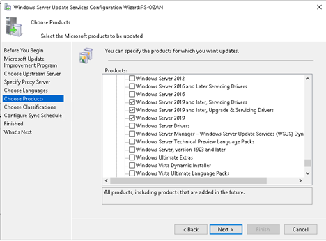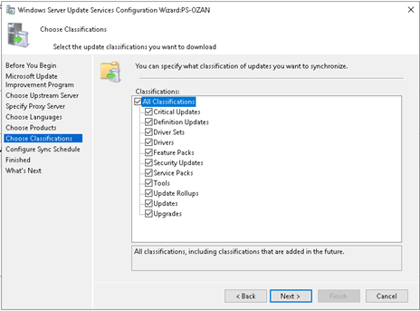 “Choose Classifications” adımında sync olmasını istediğiniz güncelleme paket türlerini seçiniz.