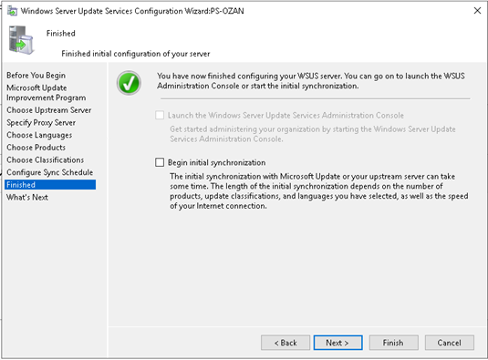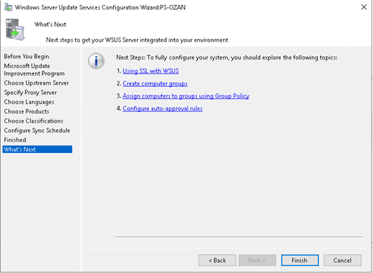 Son olarak finished adımında finish butonuna basıp bitrebilirsiniz yada next butonuna basarak WSUS için gelen yenilikleri inceleyebilirsiniz.