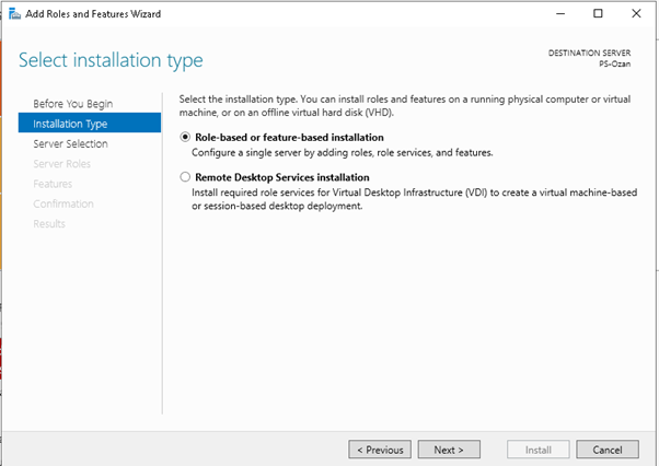 “Select installation type” adımında “role-based or feature-based installation” seçiyoruz ve next butonuna basıyoruz.