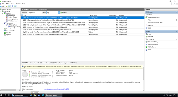 All updates adımında güncelleme paketlerini onaylamak için approval seçeneğini unapproval ve status bölümünü any olarak seçerek refresh ediyorum. İlgili güncelleme paketleri alt bölümde sıralanacaktır.