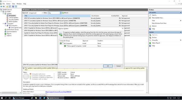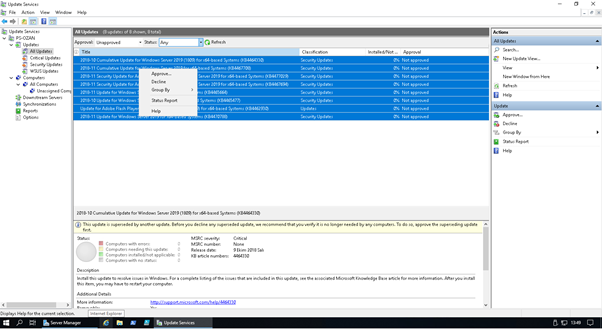 Onaylamak istediğim güncelleme paketlerini seçiyoruz ve Mouse sağ tuşu ile tıklayıp “approve” seçeneğini tıklıyoruz.