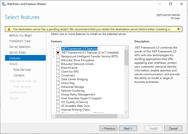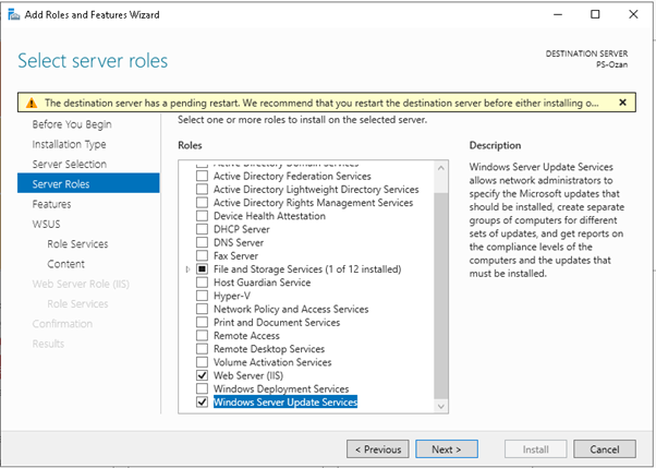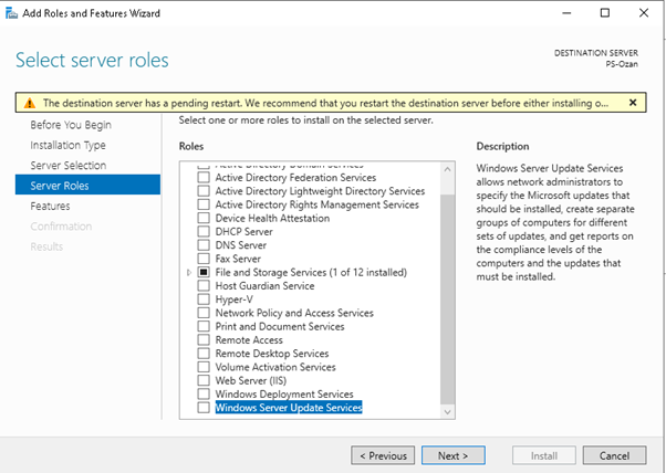 “Select server roles” adımında “Windows Server Update Services” role buluyoruz.