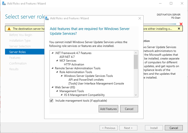 “Select server roles” adımında “Windows Server Update Services” role seçimini yaptığımızda bize “add feature that are required for Windows server update services” penceresinde kurulum için gerekli diğer role ve features listesini gösteriyor. Bu bölümde dikkat etmeniz gereken alt bölümde bulunan “Include management tools” opsiyonun seçili olmasıdır.