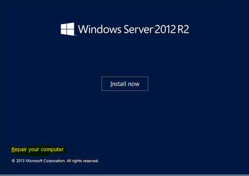 Bu hata karşılaştığınızda işletim sistemi açılmıyor. Size tek çözüm kapatın şeklindedir. Ama tek çözüm bu değil. Çözümü için serveriniza Windows Server 2012 R2 kurulum DVD mizi takıyor ve CDrom boot ederek açıyoruz.