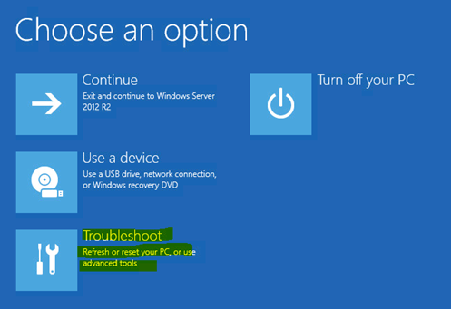 “Choose an option” ekranında ” troubleshoot” menüsüne tıklıyoruz.